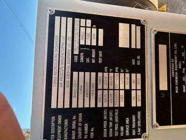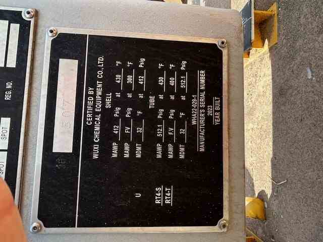 Unused 103 sq. ft. 316L Stainless Steel horizontal heat exchanger. Mfg. by Wuxi Chemical Equipment. 1.3 Design duty (MMBTU/Hr). 316L Stainless Steel Shell Design Rating : 220/FV psig @ 430/300 deg. F. Duplex 2205 Tube Design Rating: 232/FV psig @430/400 deg. F. Shell mawp 412/FV psig @ 430 deg. F. Tube mawp 512.1/FV psig @ 430 deg. F. 12.25" X 84". Serial #WHA22-029-1. National Board #507. Built 2023. T-20002 Recirculating exchanger. Under Nitrogen Purged.
