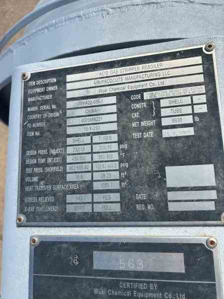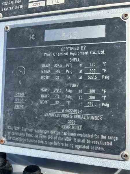 Unused 1055 sq. ft. carbon steel heat exchanger. Mfg. by Wuxi Chemical Equipment in 2023. 6.214 Design duty (MMBTU/Hr). Shell Design Rating: 232/FV psig @ 480 deg. F. Tube Design Rating: 200/FV psig @ 380 deg. F. Shell mawp 527.5/FV psig @ 430 deg. F. Tube mawp 379.6/FV psig @ 380 deg. F. 23.5" X 16'11". Serial # WHA22-086-1. National Board #563. Acid gas stripper reboiler. Under Nitrogen Purged.