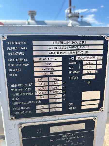 Unused 333 sq. ft. Duplex 2205 SS horizontal heat exchanger. 7.9 Design duty (MMBTU/Hr). Mfg. by Wuxi Chemical Equipment (China) in 2023. Shell Design Rating: 370/FV psig @ 300 deg. F. Tube Design Rating: 285/FV psig @ 330 deg. F. Shell mawp 662.3/FV psig @300 deg. F. Tube mawp 288.3/FV psig @ 330 deg. F. 5.5" X 16'7.5". Serial # WHA22-087-2-1-A. National Board #571. Feed/Effluent exchanger. Under Nitrogen Purged.