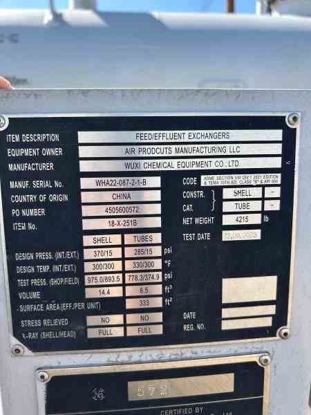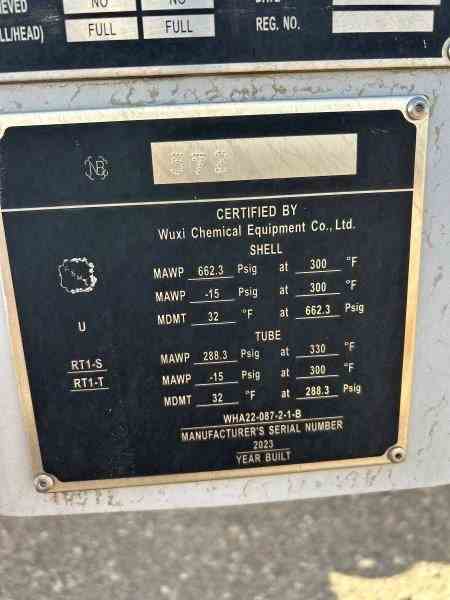 Unused 333 sq. ft. Duplex 2205 Stainless steel horizontal heat exchanger. 7.9 Design duty (MMBTU/Hr). Mfg. by Wuxi Chemical Equipment (China) in 2023. Shell Design Rating: 370/FV psig @ 300 deg. F. Tube Design Rating: 285/FV psig @ 330 deg. F. Shell mawp 662.3/FV psig @ 300 deg. F. Tube mawp 288.3/FV @ 330 deg. F. 15.5" X 16'7.5". Serial# WHA22-087-2-1-B. National Board #572. Feed/Effluent exchanger. Under Nitrogen Purged.
