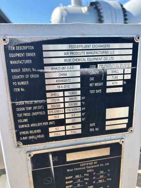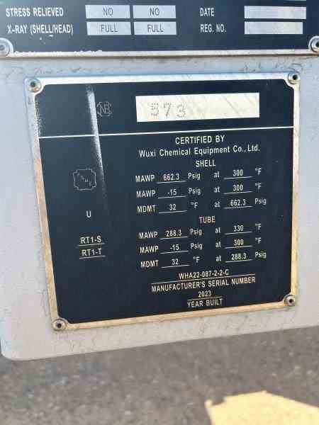 Unused 333 sq. ft. Duplex 2205 SS horizontal heat exchanger. 7.9 Design duty (MMBTU/Hr). Mfg. by Wuxi Chemical Equipment (China) in 2023. Shell Design Rating: 370/FV psig @ 300 deg. F. Tube Design Rating: 285/FV psig @ 330 deg. F. Shell mawp 662.3/FV psig @ 300 deg. F. Tube mawp 288.3/FV @ 330 deg. F. 15.5" X 16'7.5". Serial# WHA22-087-2-2-C. National Board #573. Feed/Effluent exchanger. Under Nitrogen Purged.