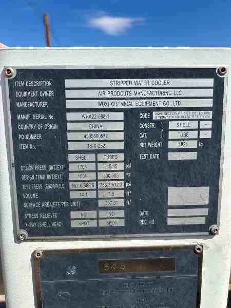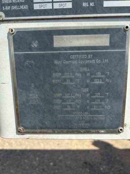 Unused 367 sq. ft. CS horizontal heat exchanger. Mfg. by Wuxi Chemical Equipment in 2023. 2.05 Design duty (MMBTU/Hr). Shell Design Rating : 170 psig @ 150 deg. F. Tube Design Rating: 215/FV psig @ 330 deg. F. Shell mawp 622.8 psig @ 150 deg. F. Tube mawp 517.1/FV psig @ 330 deg. F. 15.25" X 168". Serial# WHA22-088-1. National Board #548. Stripped water cooler. Under Nitrogen Purged.