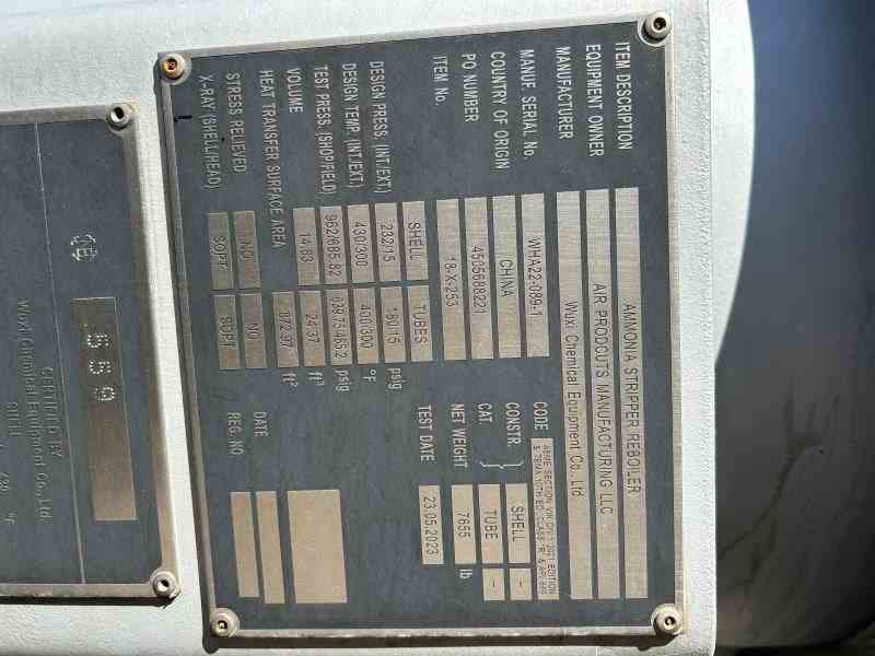 Unused 872 sq. ft. Duplex 2205 SS vertical heat exchanger. Mfg. by Wuxi Chemical Equipment (China) in 2023. 11.473 Design duty (MMBTU/Hr). Shell Design Rating: 232/FV psig @ 430/300 deg. F. Duplex 2205 Tube Design Rating: 180/FV psig @ 380/300 deg. F. Shell mawp 527.5/FV psig @ 430 deg. F. Tube mawp 373.2/FV psig @ 400 deg. F. 21.25" X 144". Serial #WHA22-089-1. National Board #559. Ammonia stripper reboiler. Under Nitrogen Purged.