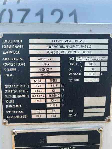 Unused 4142 sq. ft. 316L Stainless steel heat exchanger. Mfg. by Wuxi Chemical Equipment. 23 Design duty (MMBTU/Hr). 316L SS Shell Design Rating: 150/FV psig @ 330 deg. F. 316L SS Cladded Tube Design Rating: 195/FV psig @ 300 deg. F. Shell mawp 280.1/FV psig @ 330 deg. F. Tube mawp 280.1//fV psig @ 300 deg. F. 44" X 198". Serial #WHA22-033-1 National Board #542. Built 2023. Lean/Rich Amine Exchanger. Under Nitrogen Purged.