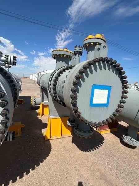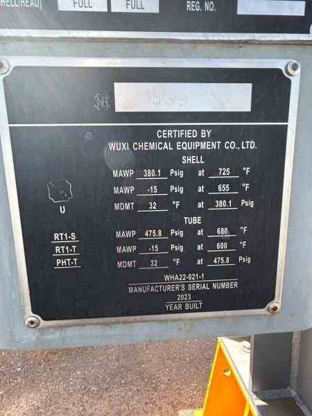 Unused 1234 sq. ft. Carbon steel heat exchanger. Mfg. by Wuxi chemical Equipment in 2023. 7.6 Design duty (MMBTU/Hr). Shell Design Rating: 250/FV psig @ 725 deg. F. Tube Design Rating: 325/FV psig @ 680 deg. F. Shell mawp 380.1/FV psig @ 725 deg. F. Tube mawp 475.8/FV psig @ 680 deg. F. 30" X 144". Serial # WHA22-021-1. National Board #539. Product Fractionator Feed/Bottoms Exchanger No. 2. Under Nitrogen Purge