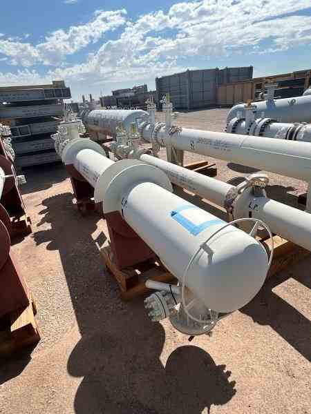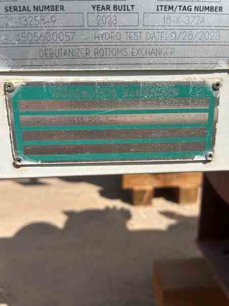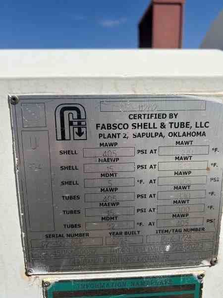 Unused 299 sq. ft. Carbon Steel heat exchanger. Mfg. by Fabsco Shell and Tube. 3.2 Design duty (MMBTU/Hr). Shell Design Rating: 375/FV psi @ 300 deg. F. Tube Design Rating: 400/FV psi @ 330 deg.F. Shell mawp 405/FV psi @ 300 deg. F. Tube mawp 405/FV psi @330 deg. F. 15.25" X 156. Serial #S2-13258-9. National Board #11282. Built 2023. Stripper Feed/Debutanizer Bottoms Exchanger. Under Nitrogen Purge