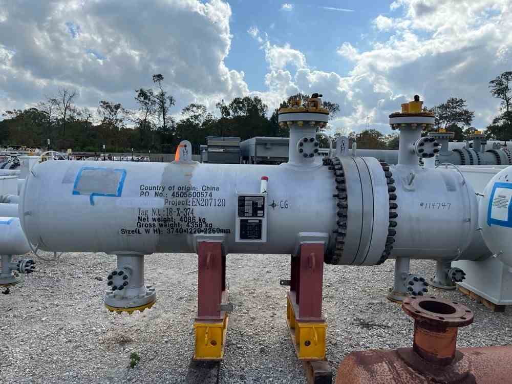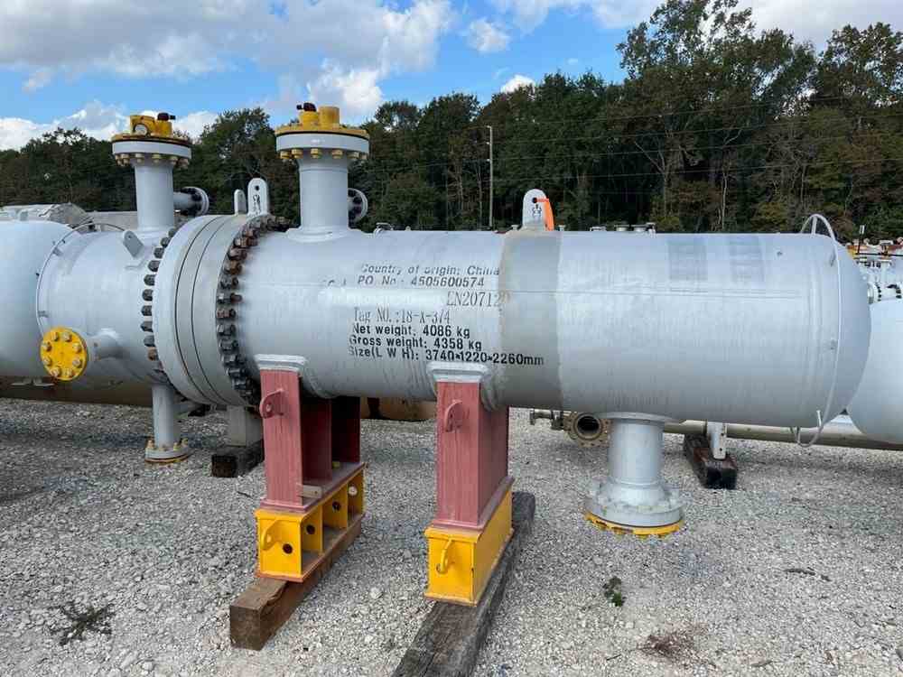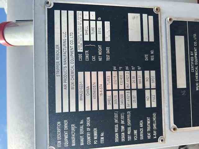 Unused 669 sq. ft. Carbon Steel horizontal heat exchanger. 6.82 Design duty (MMBTU/Hr). Mfg. by Wuxi Chemical Equipment (China). Shell Design Rating: 304/FV psig @ 340 deg. F. Tube Design Rating: 232/FV psig @ 430 deg. F. Shell mawp 478.2/FV psig @340 deg. F. Tube mawp 477.8/FV psig @ 430 deg. F. 29" X 84". Serial #WHA22-022-1. National Board #540. Built 2023. Stripper Reboiler. Under Nitrogen Purge