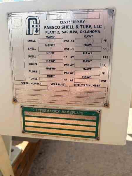 Unused 112 sq. ft. Carbon Steel heat exchanger. Mfg. by Fabsco Shell and Tube. 0.203 Design duty (MMBTU/Hr). Shell Design Rating: 425/FV psi @ 300 deg. F. Tube Design Rating: 330 psi @ 150deg. F. Shell mawp 430/FV psi @ 300 deg. F. Tube mawp 415 psi@ 150 deg.F. 10" X 176". Serial #S21-13258-14. NB #11406. Built 2023. Propane Product Cooler. Under Nitrogen Purge