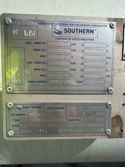 Unused 2836 sq. ft. 316L SS horizontal heat exchanger. Mfg. by Southern Heat Exchanger. 2.1 Design duty (MMBTU/Hr). Carbon Steel Shell:150FV psi @ 375 deg. F. 316L Stainless steel Tubes: 161FV psi @ 375 deg. F. 40" X 180". Serial #22-0251. National Board #16151. Built 2023. Anaerobic Reactor Heat Exchanger. Under Nitrogen Purge