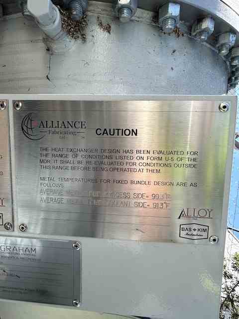 Unused Stainless Steel 2685 sq. ft. vertical shell and tube heat exchanger. 7.5 Design duty (MMBTU/Hr). Manufactured by Alliance Fab (Graham) in 2022. CS Shell Rated 150 psi @212F. 304SS Tubes rated 50FV psi @ 400F. Dimensions: 34" x 156".