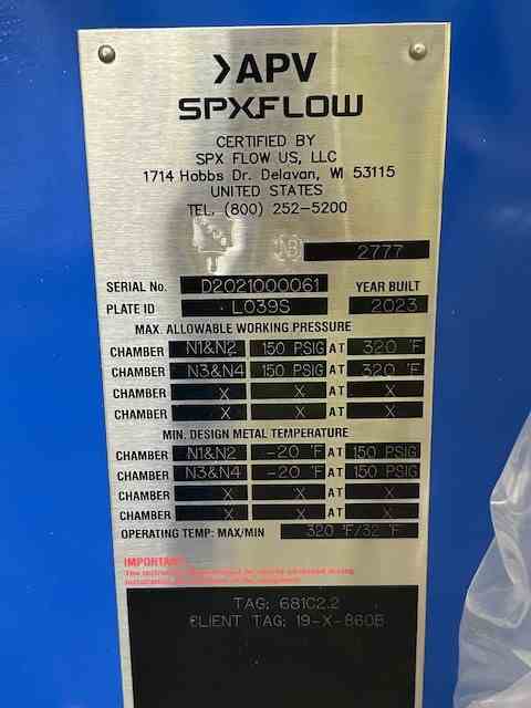 Unused 316L Stainless Steel 1021 sq. ft. vertical Plate and Frame heat exchanger. Manufactured by APV (SPX Flow) in 2023. 8.7 Design duty (MMBTU/Hr). Model #L039M-10. Rated 150 psi @ 320F. Serial #D2021000060, NB #2776. Designed as Treated Feed Rundown Cooler. Under Nitrogen Purge. S/N D2021000061, NB #2777.