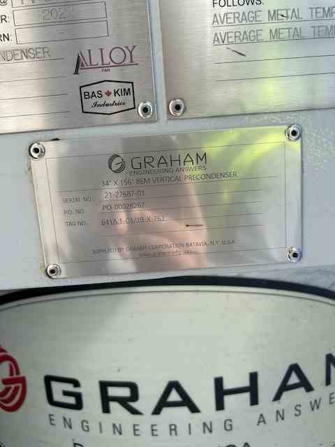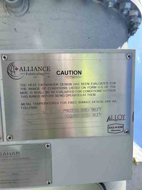 Unused 2,685 sq. ft. 304 SS vertical shell and tube heat excahnger (4.6 MMBTU/Hr), Manufactured by Alliance Fab (Graham) in 2022. CS Shell rated 150 psi @212F. 304SS Tubes rated 150psi/FV psi @400F. Dimensions: 34" × 156". Used as Primary surface condenser. Serial #1342, NB #164.