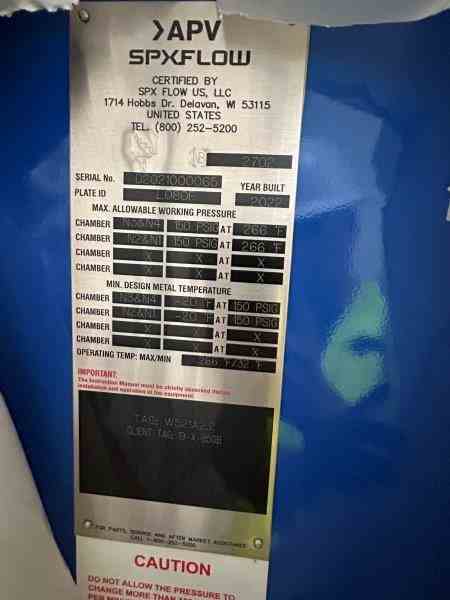 Unused 562 sq. ft. Titanium GR1 vertical plate & frame heat exchanger (4.85 MMBTU/Hr). Manufactured by APV in 2023, rated 150 psi @ 266 °F, designed as oil/oil HX. Under Nitrogen Purge. Serial #D2021000065, NB #2702.
