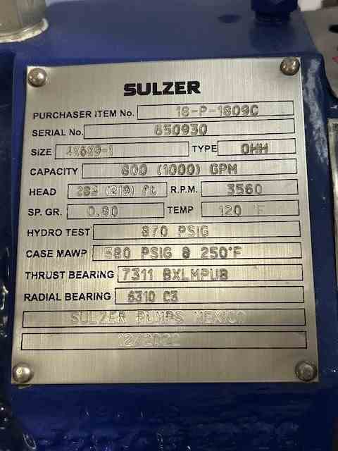 Unused 100 HP Centrifugal Pump - 316SS. Raw Feed Transfer Pump. Mfg. by Sulzer. Size 4x6x9-1. 1000 gpm @ 219' head. 580 psi @ 250 deg. F. Casing 316SS; Impeller 316SS. API Class: A-8. With 100 hp motor.