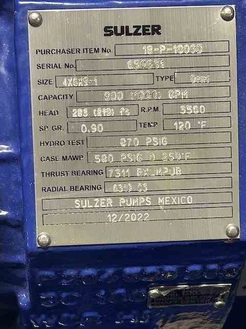 Unused Sulzer 1000 GPM Centrifugal Pump. Raw Feed Transfer Pump. Size 4x6x9-1. 1000 gpm @ 219' head. 580 psi @ 250 deg. F. Casing 316SS; Impeller 316SS. API Class: A-8. With 100 hp motor.