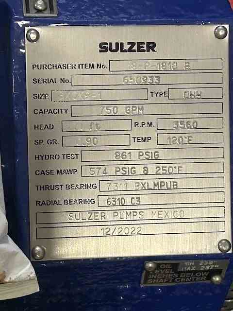 Unused 700 GPM Stainless Steel Horizontal Centrifugal Pump. Pretreat Feed Pump. Built by Sulzer. Size 3x6x9-1. 700 gpm @ 399' head. 574 psi @ 250 deg. F. Casing 316SS; Impeller 316SS. API Class: A-8. With 100 hp motor.