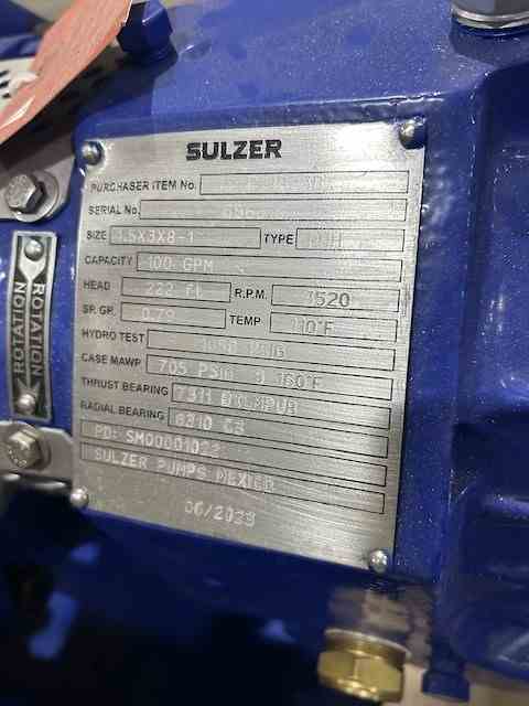 Unused 15 hp Centrifugal Pump. CARB Diesel Blending Pump. Mfg. by Sulzer. Size 1.5x3x8-1. 100 gpm @ 222' head. 705 psi @ 160 deg. F. Casing CS. Impeller 12 Cr. With 15 hp motor. Serial #656618.