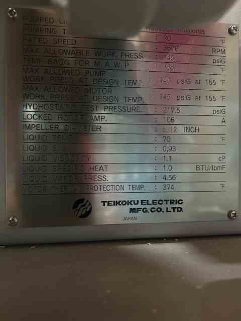 Unused 150 GPM 304 Stainless Steel Horizontal Centrifugal Pump. Built by Teikoku. Size 3x2. 150 gpm @ 80.6' head. 145 psi @ 155 deg. F. Casing 304SS. Impeller 304SS. With estimated 15 hp motor. Aqueous Ammonia Loading Pump.