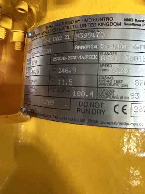 Unused 15HP Magnetic Driven Single Stage Centrifugal Pump. Mfg. by Sundyne HMD Kontro. 46 gpm @ 246 head. 580 psi @ 170 deg. F. Casing 25% Chr Duplex St. Impeller 25% Chr Duplex St. With 15 hp motor. Serial # 839917A. Ammonia Stripper Reflux Pump.