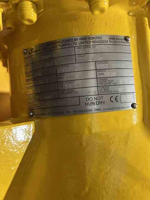 Unused 134 GPM Magnetic Driven Single Stage Centrifugal Pump. Mfg. by Sundyne HMD Kontro. 134.3 gpm @ 155.4 head. 580 psi @ 150 deg. F. Casing 316L SS. Impeller 316L SS. With 20 hp motor. Serial #839918B. Transfer Pump.