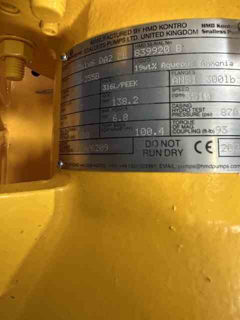 Unused 60.7 GPM Magnetic Driven Single Stage Centrifugal Pump. Mfg. by Sundyne HMD Kontro. 60.7 gpm @ 138.2 head. 580 psi @ 160 deg. F. Casing 316L SS. Impeller 316L SS. With 7.5 hp motor. Serial # 839920B. Aqua Ammonia Pump.