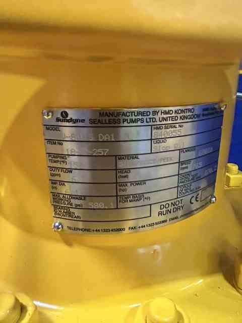 Unused 7.5HP Magnetic Driven Single Stage Centrifugal Pump. Slop Oil Pump. Mfg. by Sundyne HMD. 6.7 gpm @ 49 head. 564 psi @ 170 deg. F. Casing 316L SS. Impeller 316L SS. With 7.5 hp motor. Serial #840055