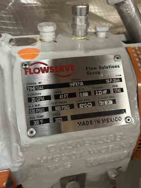 Unused 20 Gpm 316L SS Centrifugal Pump. Mfg. by Flowserve. 20 gpm @ 41 head. 535 psi @ 300 deg. F. Casing 316L SS. Impeller 316L SS. With 5 hp motor. Serial #21HE1044 . Slop Oil Pump.