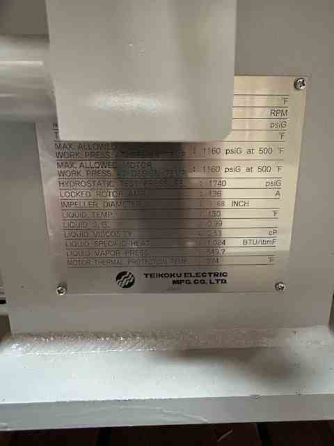 Unused 20 HP Hastelloy Centrifugal Pump. Mfg Teikoku. Size 2x1.5. 60 gpm @ 227 head. 1160 psi @ 500 deg. F. Hastelloy With 20 hp motor. Serial # . Wash Water Circulation Pump.