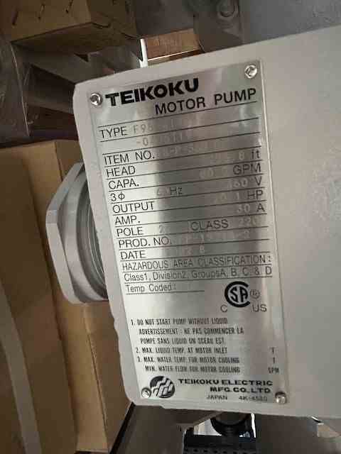 Unused 60GPM Hastelloy Centrifugal Pump. Mfg Teikoku. Size 2x1.5. 60 gpm @ 227 head. 1160 psi @ 500 deg. F. Hastelloy With 20 hp motor. Wash Water Circulation Pump.
