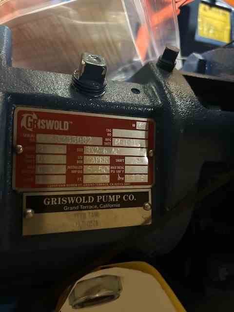 Unused 5 hp Horizontal Aerobic Reactor Heat Exchanger Pump. Model 311S. Mfr Griswold. 115 gpm @ 20' head. Casing: Ductile Iron. Impeller: Duplex SS. 5 HP motor. S/N 0040233082