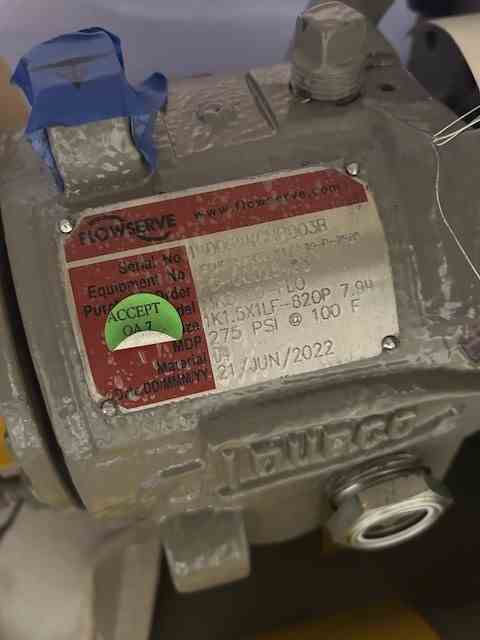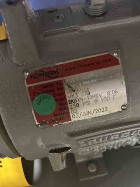 Unused 885 gpm 316SS Horizontal Centrifugal Pump. . Mfg. by Durco (Flowserve).@ 52' head. Size 2K6x4-10HRV-8.06. Type MK3 STD. MDP 250 psi @ 100°F. Casing: DCI. Impeller: 316SS. 20 HP motor. Serial #1400944CHP015A. Designed as Rundown Cooler Cooling Water Pump.