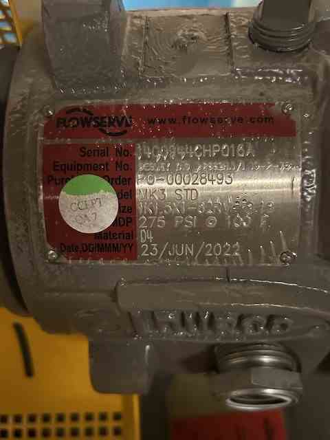 Unused 15 HP Horizontal Centrifugal Pump. Mfg. by Durco (Flowserve). Size MK3 STD. Type 1k1.5x1-82RV8.18. 94 gpm @ 148' head. MDP 275 psi @100 deg. F. 302 deg. F. Casing: 316SS. Impeller: 316SS. 15 HP motor. Serial #1400944CHP016A. Heel Collecting Tank Discharge Pump.