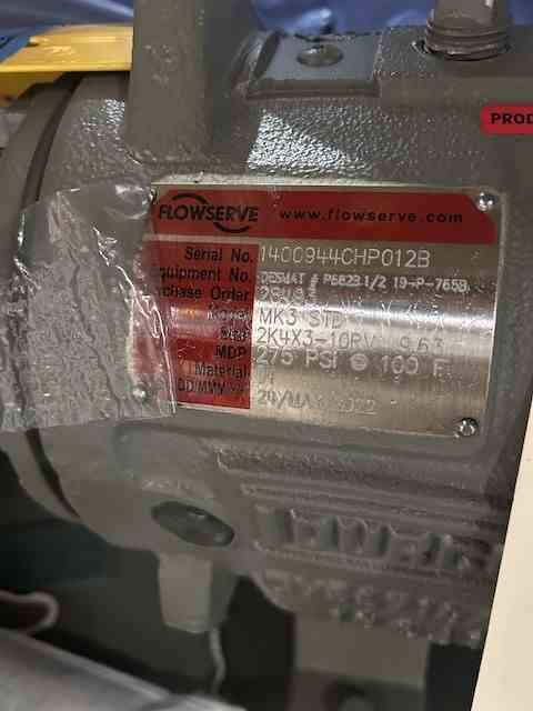 Unused 526gpm 316 Stainless Steel Horizontal Centrifugal Pump. Mfr. by Durco (Flowserve). Size 4x3-10RV9.63. Type MK3 STD. 526 gpm @ 358' head. MDP 275 psi @ 100 deg. F. 302 deg. F. Casing: 316SS. Impeller: 316SS. 100 HP motor. Serial #1400944CHP012B. Bleached Oil Filter Tank Pump.