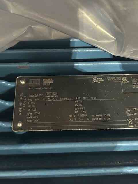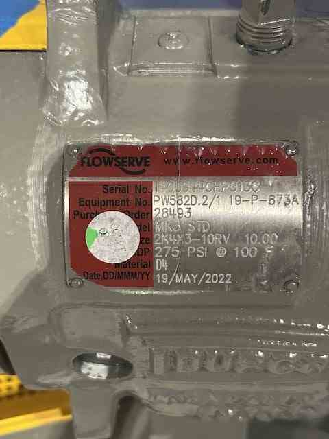 Unused 447 gpm 316 SS Horizontal Centrifugal Pump. Mfg. by Durco (Flowserve). Model Mark III. @ 190' head. Size 2K4x3-10RV-10.00. Type MK3 STD. MDP 275 psi @ 100°F. 248°F. Casing: 316SS. Impeller: 316SS. 60 HP motor. Serial #1400944CHP013C. Designed as Oil Collecting Tank Discharge Pump.