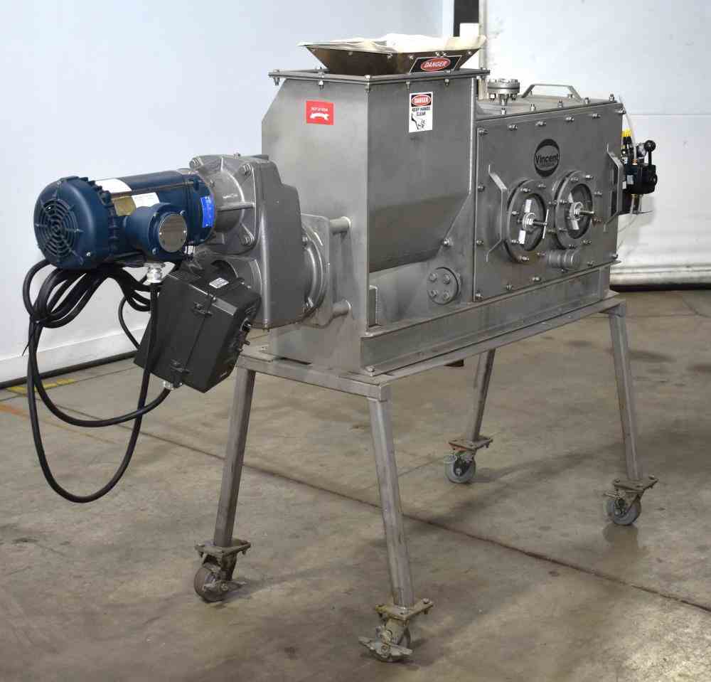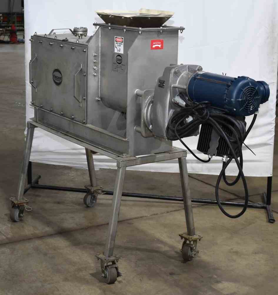 Used Vincent Model CP-4-VT Stainless Steel Screw Press. Vapor Tight. 110 lbs per hour. 98% Oleoresin recovery and 75-80% ethanol recovery. 4" Diameter screw with (4) stages of compression features interrupted, reducing pitch flights. Lesson 1.5 HP Motor. Model # 145T17XK6A with Nord Drive Systems Gear Box. Ratio 88.74 to 1. Model # 3282AFBVLN140TC. KC Genesis AC Motor Speed Control. Model # KBAC-27D (3G) (GRY) (9520T). Food grade ready on all contact components Explosion proof motor. Mounted on stand with (4) casters.