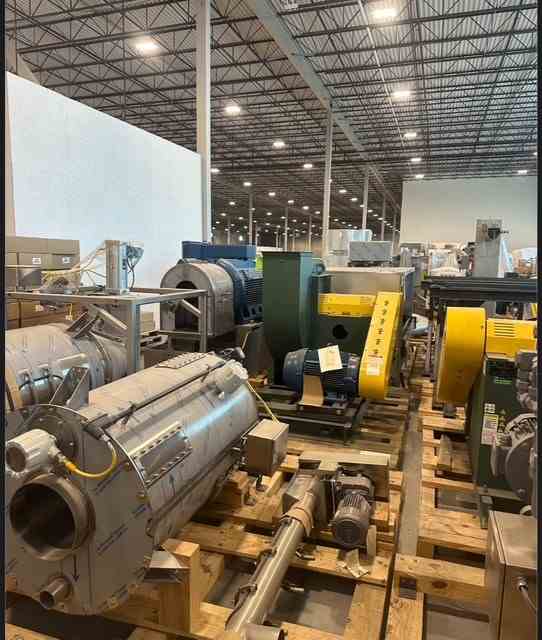 Unused 115mm Twin-Screw food extruder line with preconditioner. Manufactured by Wenger. Model TX-115. Approximate capacity: 2.5 - 5 TPH depending on product (6,600–11,000 lb/hr of soy). Includes Wenger 24S22-2 belt dryer/cooler, Urschel Comitrol mill, hammermill, sifter, silos, pneumatic conveying. Designed for soy processing (full-fat soy, texturized soy protein / TVP). Built 2022. System never installed. Still in crates.