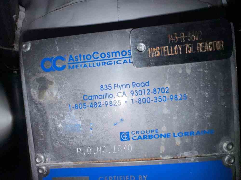 Used 75L Hastelloy Reactor. Manufactured by AstroCosmos. Vessel MAWP 8PSI/FV@392F. Jacket 80PSI/FV@392F. .33HP motor. Center Bottom outlet. (4) leg mounted on casters. Serial #76817. Built 2001.