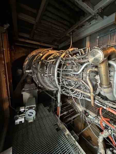 Used 41.5 MW Gas Turbine Generator, manufactured by General Electric. Model LM5000 STIG. Natural gas fueled. Rated Exhaust Gas Power 73000. Inlet Temp 59°F, Altitude 0. Inlet Loss 4.0 in H2O. Brush generator, 46128 kVa. 3600 R/Min, 13800 v/3/60 hz. Frame BDAX-7-290SS, air cooled brushless. The scope includes a gas turbine compartment with a complete lube oil system, air inlet system, enclosure ventilation, and CO2 firefighting skid. Generator with enclosure, motor control center, switchgear, and generator protection, synchronization, and control panels. Built in 1989, 1,197 starts, 38,519 fired hours. Borescope reports available upon request.