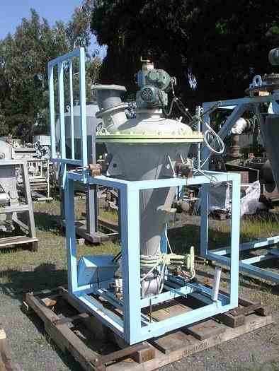 Used 3.5 Cu Ft 304 Stainles Steel Nauta mixer. Manufactured by Shinkou Pantec Co. Model SV00 V-1. 100 Liters. Urethane lining. Cone measures 30" top opening x 5" bottom opening x 40" deep. Manual slide gate with rotary air lock. Top head includes dual drive assembly to rotate Nauta mixing arm and screw. Bolted top lid with 6" diameter top feed opening. Mounted on carbon steel frame, includes controls.