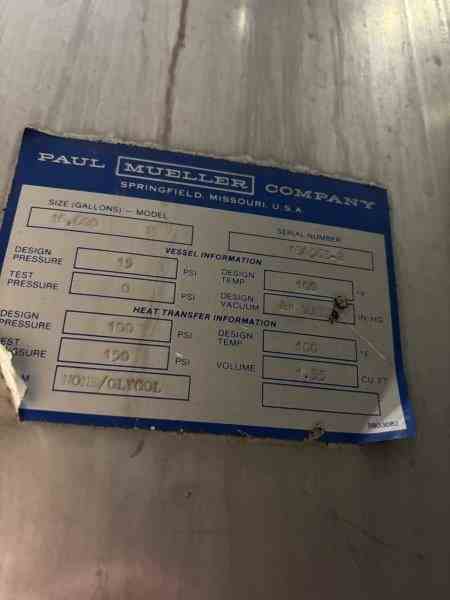 Used 16600 Gallon 304 Stainless Steel tank, jacketed, cone bottom. Manufactured by Mueller. Dished head. 10' 1 7/8" OD x 36' 11 3/8" Tall. Shell rated 15 psi @100F. Jacket rated 100 psi @100F. Weight 13200 lbs. Built 1995. Serial #164563-2. Previous use: 400 BBL brewery fermentation vessel.