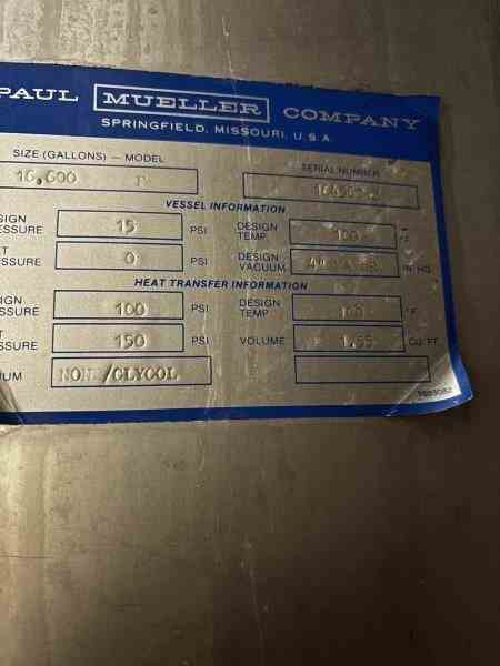 Used 16600 Gallon (400 BBL) 304 Stainless Steel tank, jacketed, cone bottom. Manufactured by Mueller. Dished head. 10' 1 7/8" OD x 36' 11 3/8" Tall. Shell rated 15 psi @100F. Jacket rated 100 psi @100F. Weight 13200 lbs. Built 1995. Serial #164563-3. Previous use: 400 BBL brewery fermentation vessel.