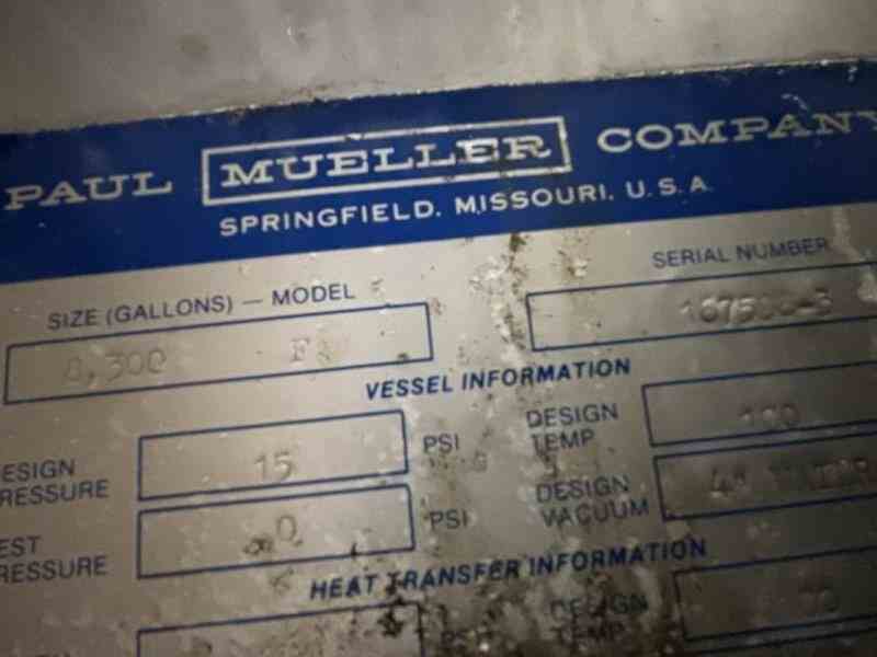 Used 8300 gallon 304 Stainless Steel tank, jacketed, cone bottom. Manufactured by Mueller. Model F. Internal 15PSI@100F. Cooling Jacket 100PSI@100F. Dome top. 265"OAH x 117"ID. (4) Leg mounted. Serial #167598-3. 8680 lbs weight. Built 1995. Previous use: 250 BBL Brewery Brite Beer Tank.