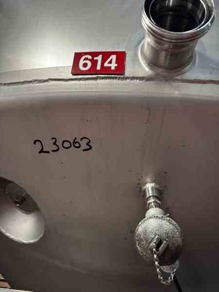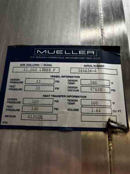 Used 5700 gallon (21000 L) 304 Stainless Steel Pressure Vessel, jackated, cone bottom. Manufactured by Mueller. Dome Top, Model F. Internal 25PSI@100F. Jacket 100PSI@100F. 95"ID x 155" T/T. 268"OAH. (4) leg mounted. 16" Bottom cone manway with 3" CBO. National Board #45318. Serial #384634-4. Built 2008. Previous Use: 400 BBL Brewery Brite Beer Tank.