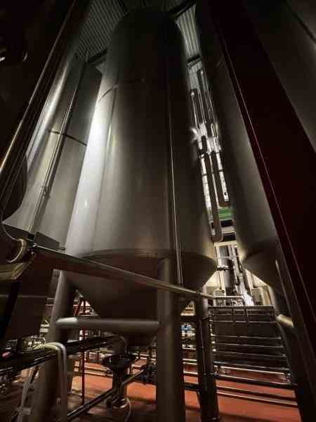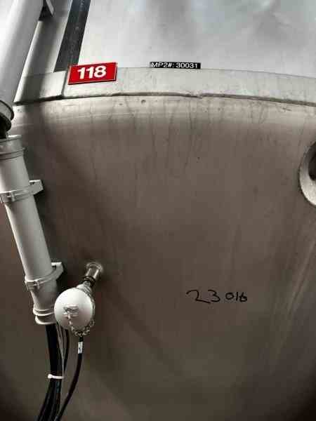 Used 16,600-gallon 304 stainless steel tank, jacketed, cone bottom. Manufactured by Mueller. Dished head. 10' 1 7/8" OD x 36' 11 3/8" tall. Shell rated 15 psi @ 100°F. Jacket rated 100 psi @ 100°F. Weight: 13,200 lbs. Built in 1995. Serial #164563-14. Previous use: 400 BBL brewery fermentation vessel.