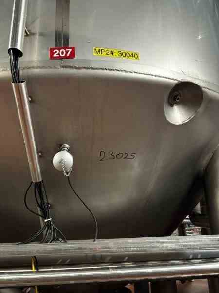 Used 16600 Gallon 304 Stainless Steel tank, jacketed, cone bottom. Manufactured by Mueller. Dished head. 10' 1 7/8" OD x 36' 11 3/8" Tall. Shell rated 15 psi @100F. Jacket rated 100 psi @100F. Weight 13200 lbs. Built 2008. Previous use: 400 BBL brewery fermentation vessel.