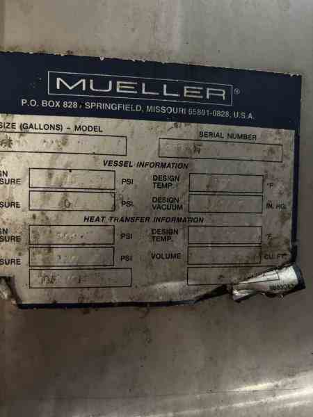 Used 16600 Gallon 304 Stainless Steel tank, jacketed, cone bottom. Manufactured by Mueller. Dished head. 10' 1 7/8" OD x 36' 11 3/8" Tall. Shell rated 15 psi @100F. Jacket rated 100 psi @100F. Weight 13200 lbs. Serial #361707-4. Built 2008. Previous use: 400 BBL brewery fermentation vessel.