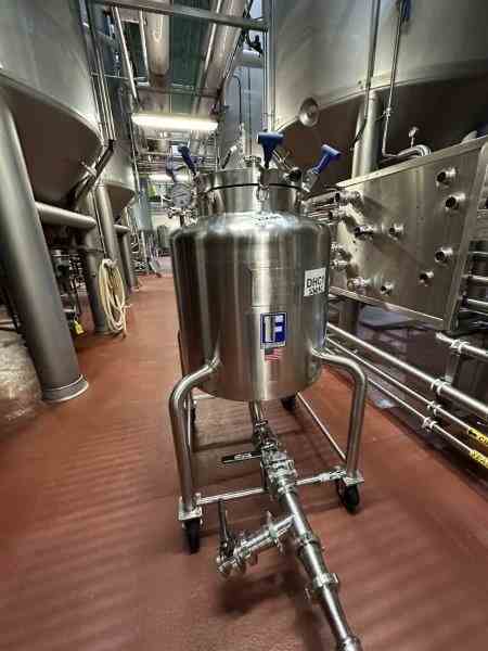 Used approx 50 gallon 304 Stainless steel pressure vessel. Manufactured by Feldmeier. MAWP 75PSI/FV@200F. Dome top, Dish bottom. (4) Leg mounted with casters. Serial #20E5108. National Board #11104. Built 2021.