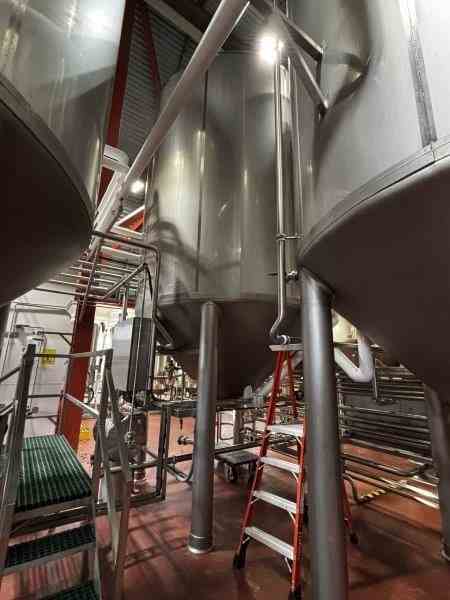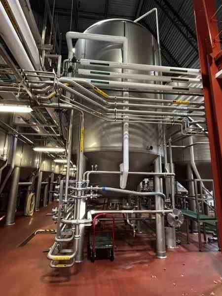 Used 8300 gallon 304 Stainless Steel tank, jacketed, cone bottom. Manufactured by Mueller. Model F. Internal 14.9PSI@100F. Cooling Jacket 100PSI@100F. 143"T/T x 117"ID. 267" OAH. Dome top. 16" Bottom cone manway with 3" CBO. (4) Leg mounted. Serial #18101280301-08. Built 2010. 200 BBL brewery fermentation vessel.