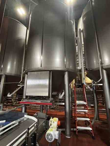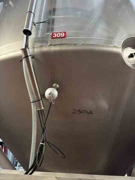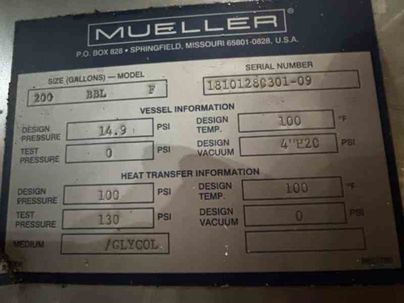 Used 8300 gallon 304 Stainless Steel tank, jacketed, cone bottom. Manufactured by Mueller. Model F. Internal 14.9PSI@100F. Cooling Jacket 100PSI@100F. 143"T/T x 117"ID. 267" OAH. Dome top. 16" Bottom cone manway with 3" CBO. (4) Leg mounted. Serial #18101280301-09. Built 2010. 200 BBL brewery fermentation vessel.