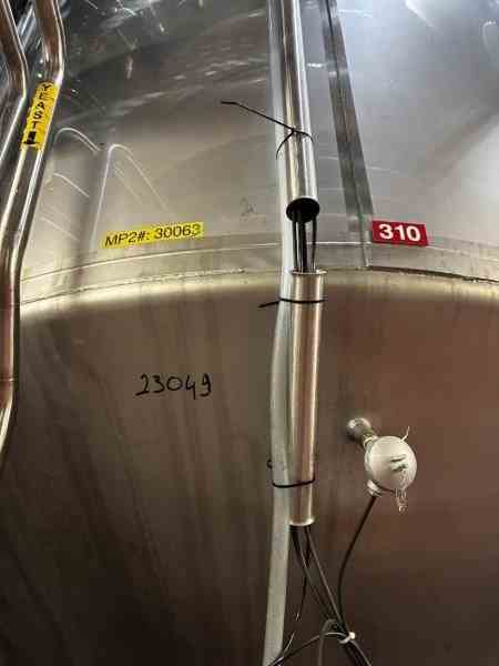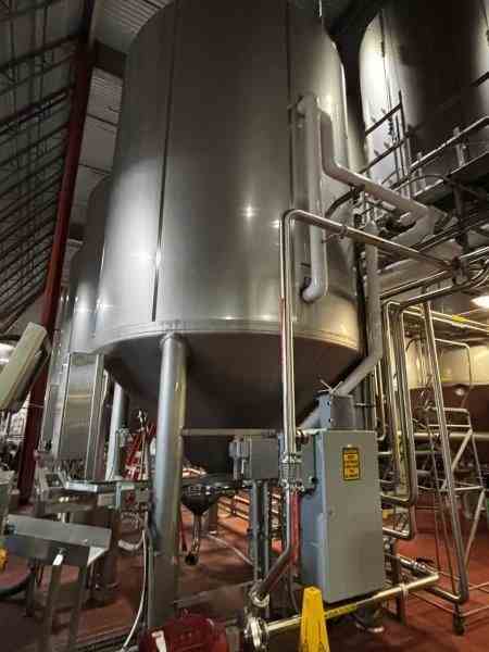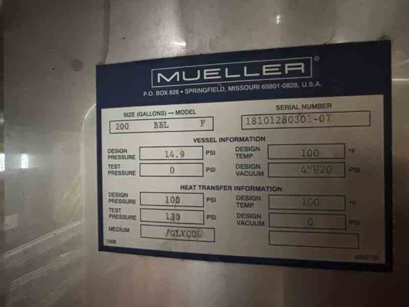 Used 8300 gallon 304 Stainless Steel tank, jacketed, cone bottom. Manufactured by Mueller. Model F. Internal 14.9PSI@100F. Cooling Jacket 100PSI@100F. 143"T/T x 117"ID. 267" OAH. Dome top. 16" Bottom cone manway with 3" CBO. (4) Leg mounted. Serial #18101280301-07. Built 2010. 200 BBL brewery fermentation vessel.